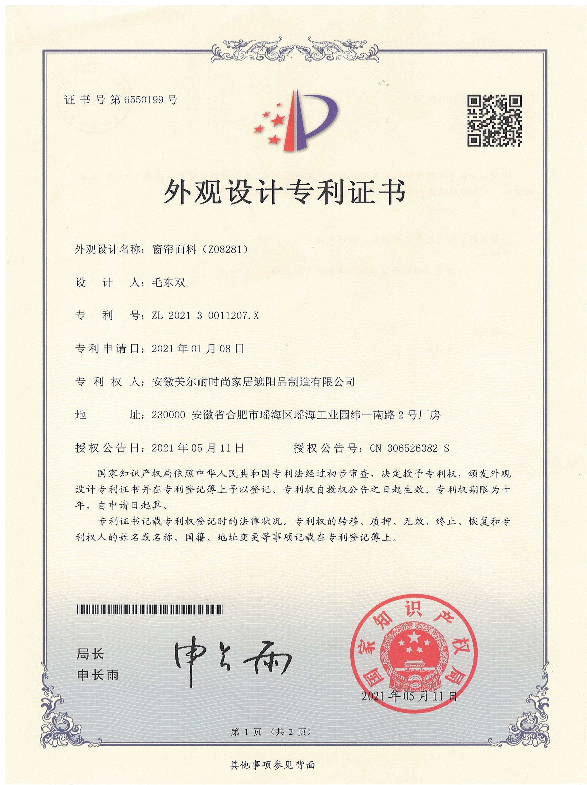 《智能窗簾》外觀設計專利證書