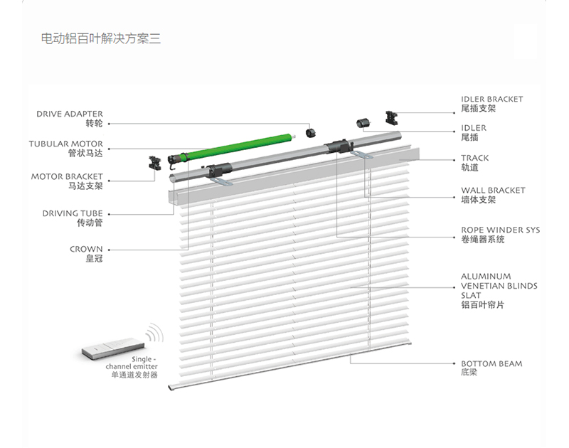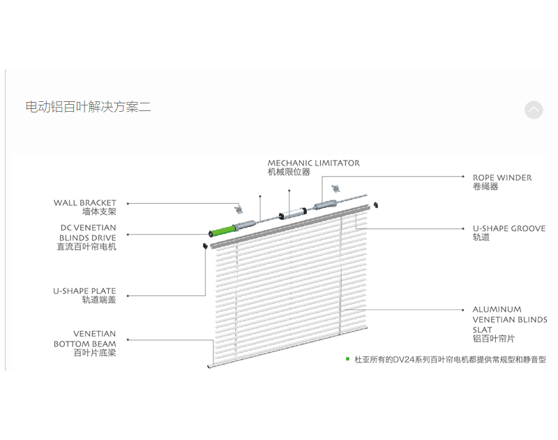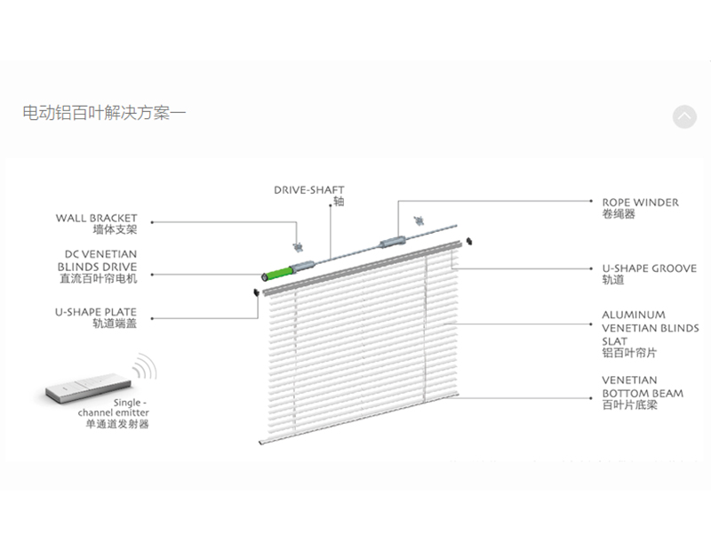 MotorizedAluminiumVenetianBlinds電動鋁百葉室內電動鋁百葉使用鋁合金簾片,通過卷繩系統帶動簾體的上下運行及簾片翻轉,起到光線調節與