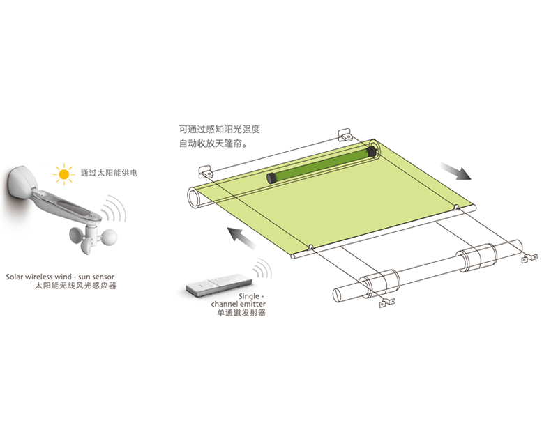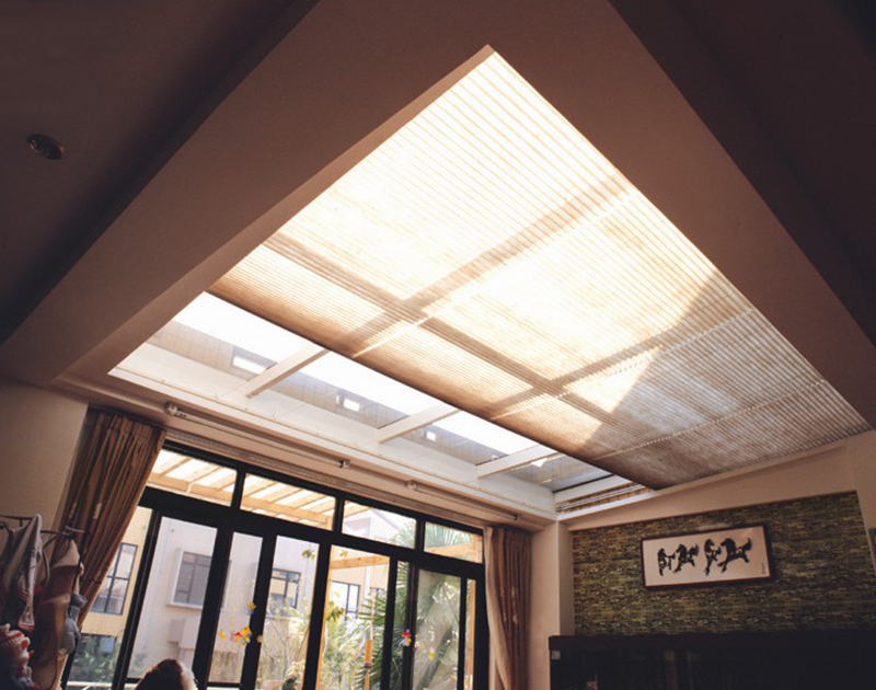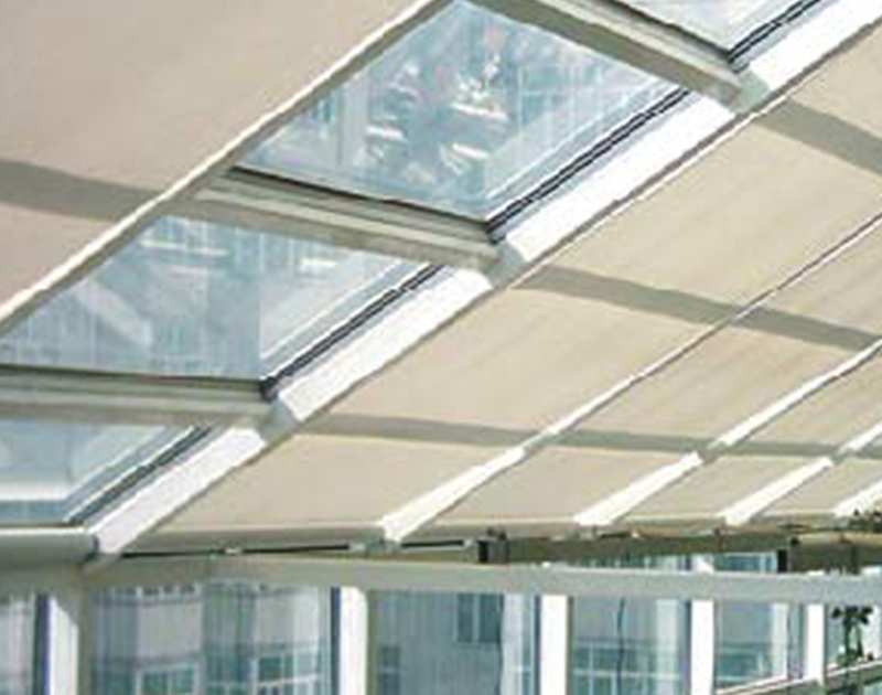 室內(nèi)天篷簾由電機及傳動裝置,支承構(gòu)件及簾布等組裝而成。且簾布與水平面夾角小于75,用于透明屋面在水平,傾斜